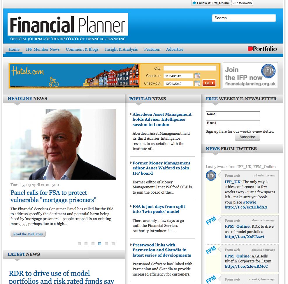 Financial Planner Online is the news website for the quality professional magazine Financial Planner. It attracts over 3,600 unique visitors a month and typically 250,000 to 300,000 page impressions.